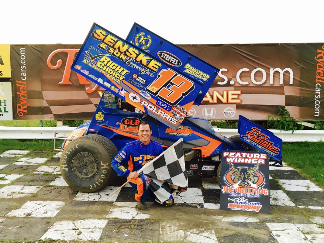 Mark Dobmeier wins twice in a double feature night at River Cities Speedway. On fan appreciation night the familiar #13 gave onlookers exactly what they wanted to see. After winning the first feature, Mark took his Grinch Racing EAGLE to the back of the pack for a full invert and drove through the field to clinch a second victory and sweep the evenings feature events.